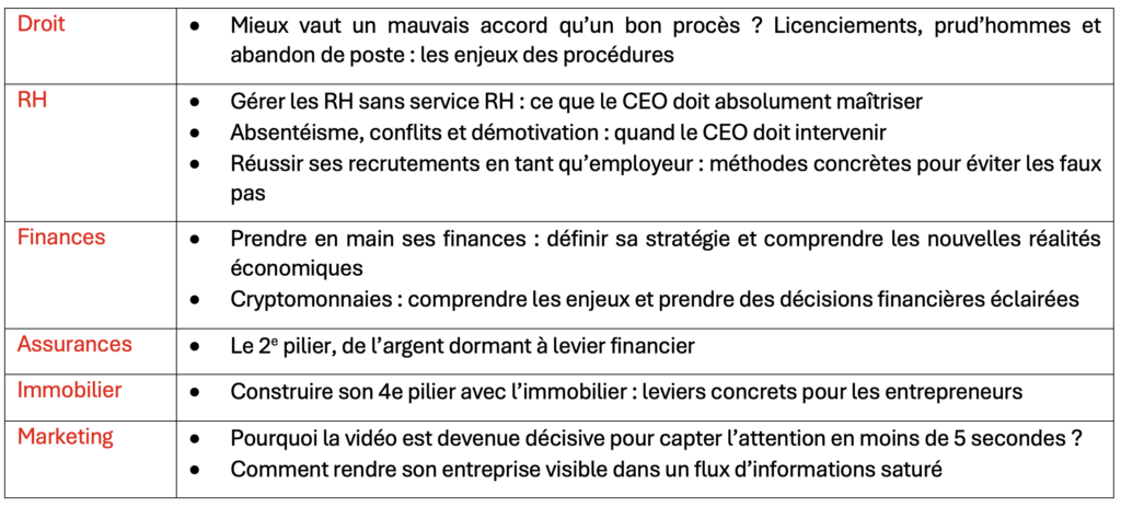 - Des webinaires et séminaires dédiés à des thématiques clés, utiles et concrètes pour les entrepreneurs.